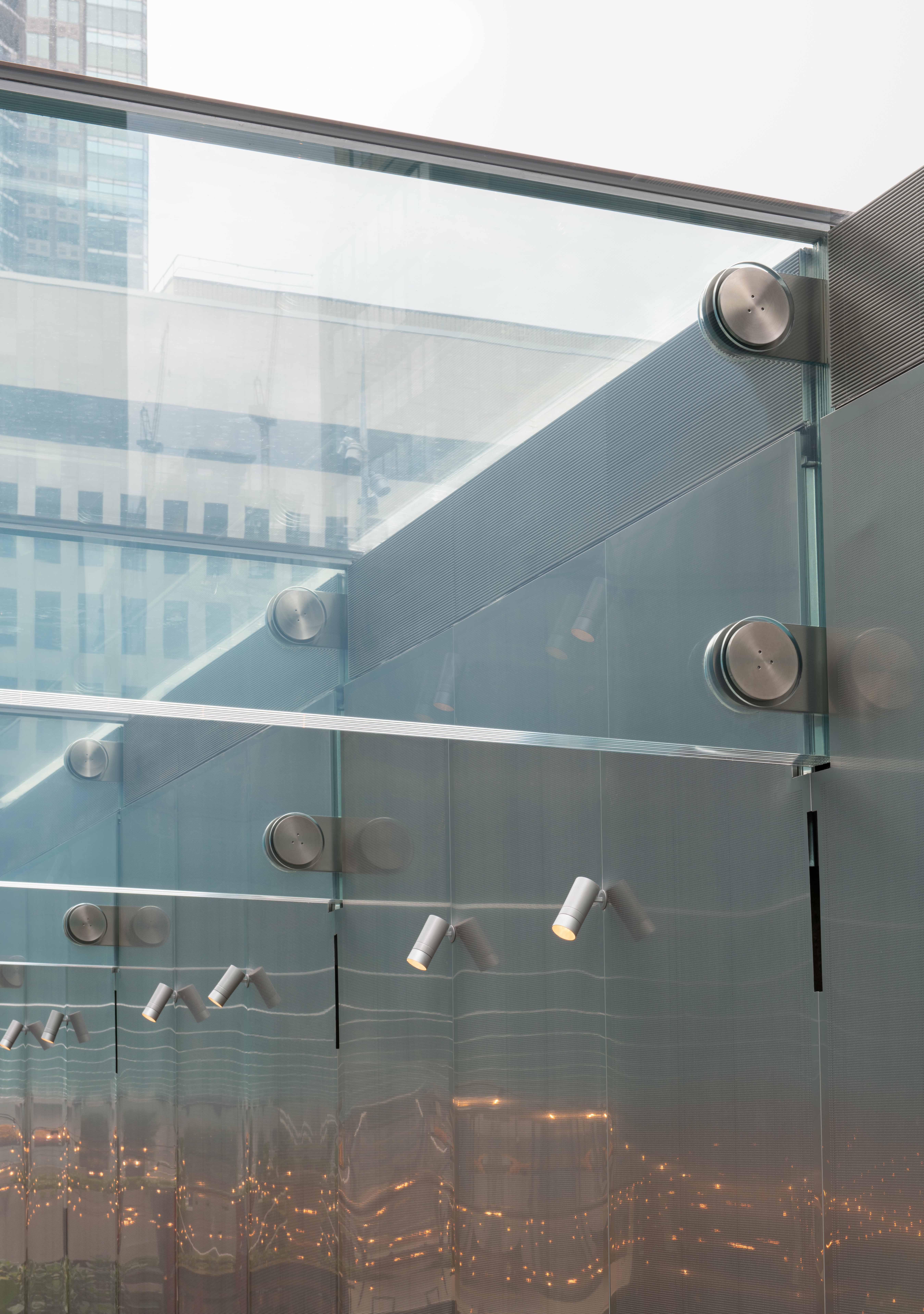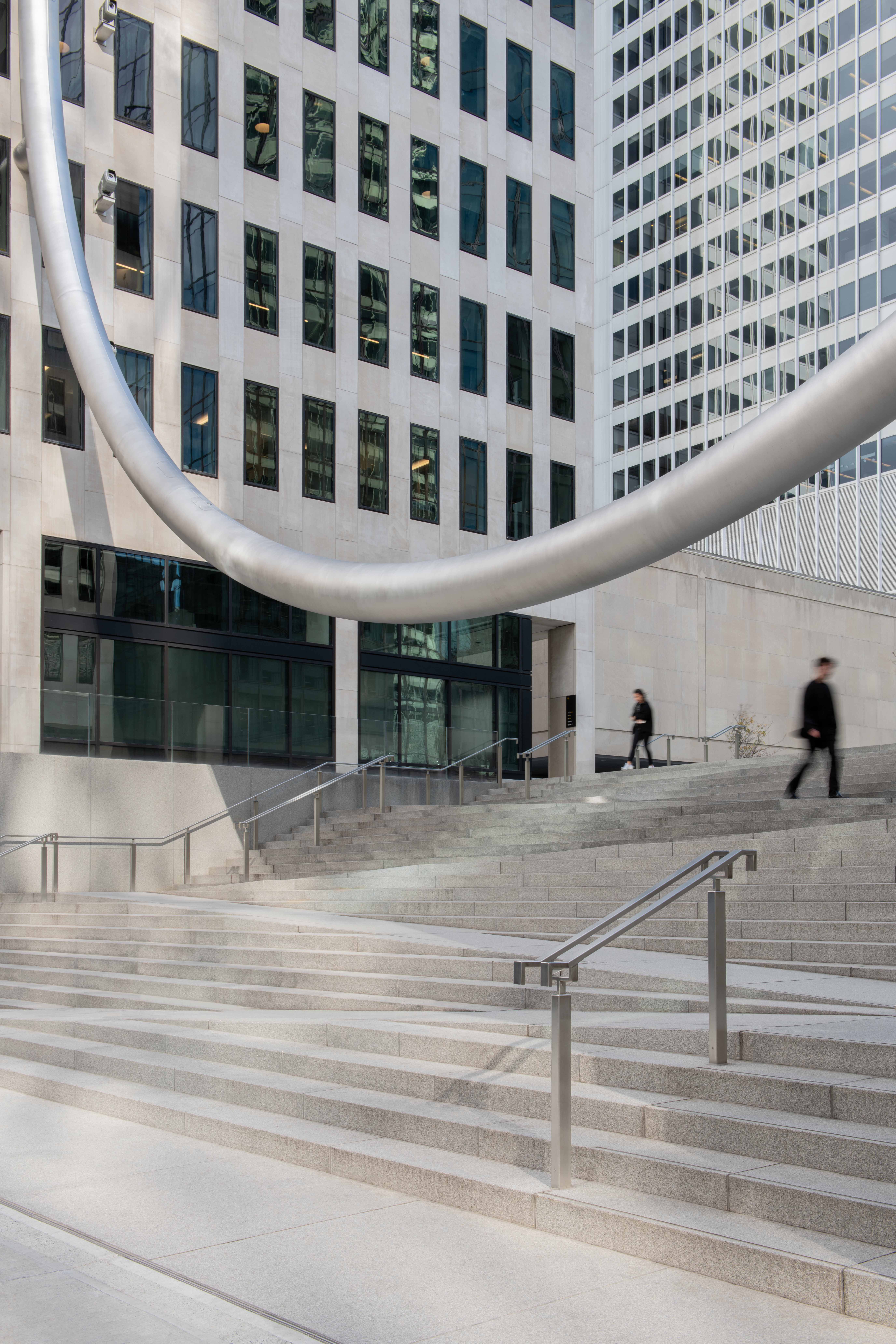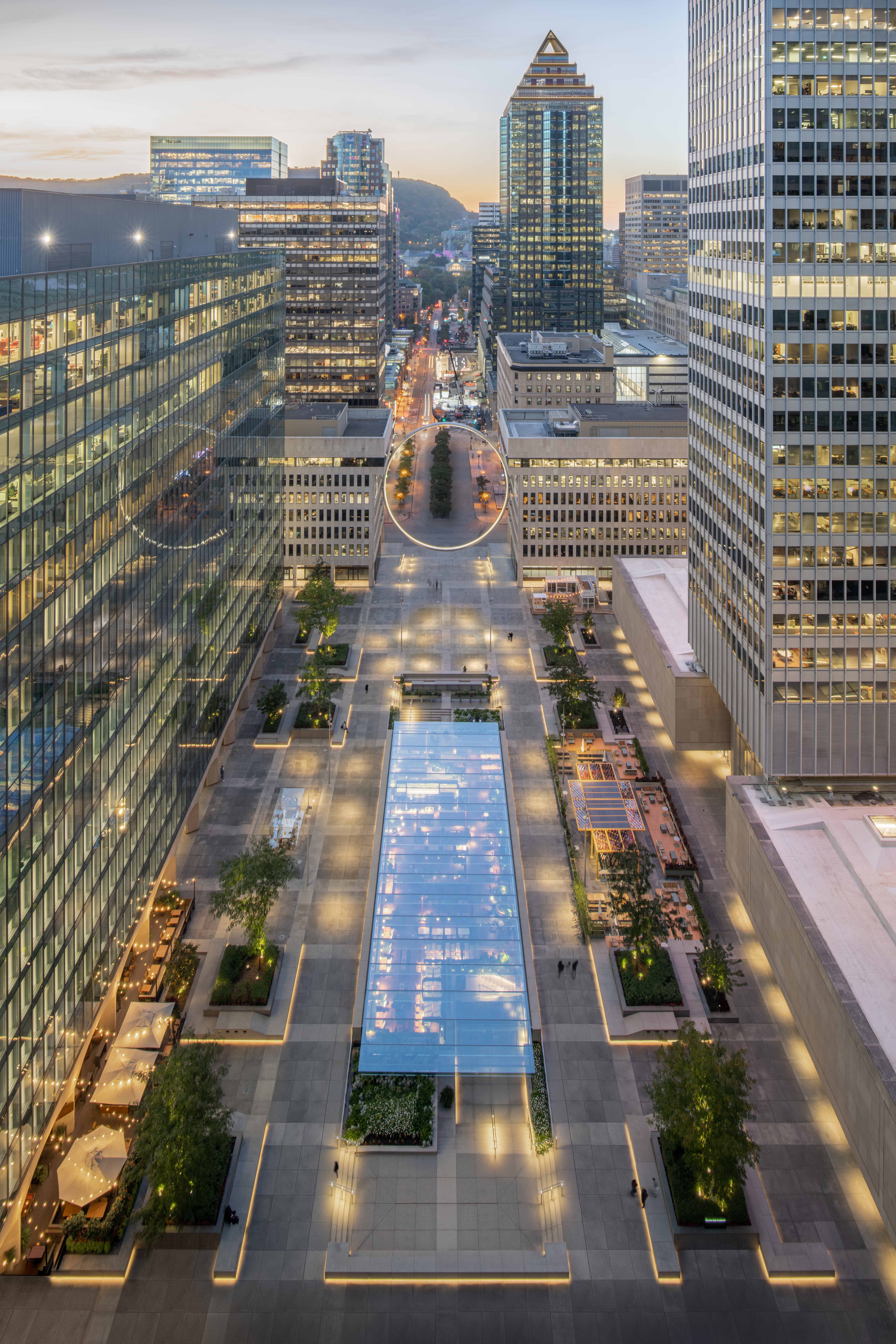 The simplicity of detail makes the space easy to read. It dissolves the boundaries between the business district, social areas, and cultural areas. The renewed Esplanade thus captures the abundant dynamism of its urban environment and links life on the street to the interior of the buildings. Paramount in the transformation is the reopening of the periphery of Place Ville Marie. Lined with stairs around the buildings and a new monumental staircase, the public square invites circulation between the street and the interior. This staircase includes an embedded access ramp and creates a direct link that ensures fluid movement between the street and the raised public space. The large entrance to the underground parking lot that previously favoured vehicular crossings was moved aside to welcome foot traffic. Once punctuated by four modest skylights, the Esplanade now boasts one of the largest horizontal glass structures in North America. The reflective effect created by this glass pavilion is reminiscent of the water basins typical of the public squares of the modernist era. This impressive, seemingly floating structure provides direct access to the 4-season Cathcart Restaurants & Biergarten in the heart of the underground gallery.
