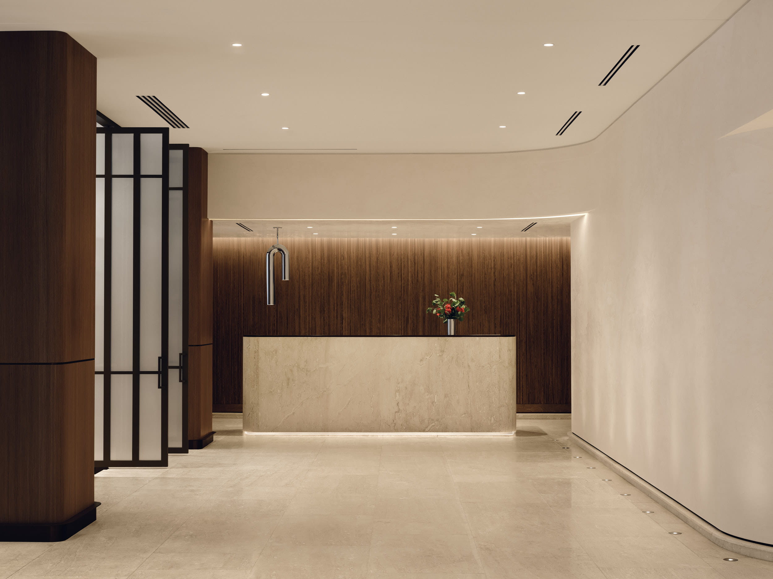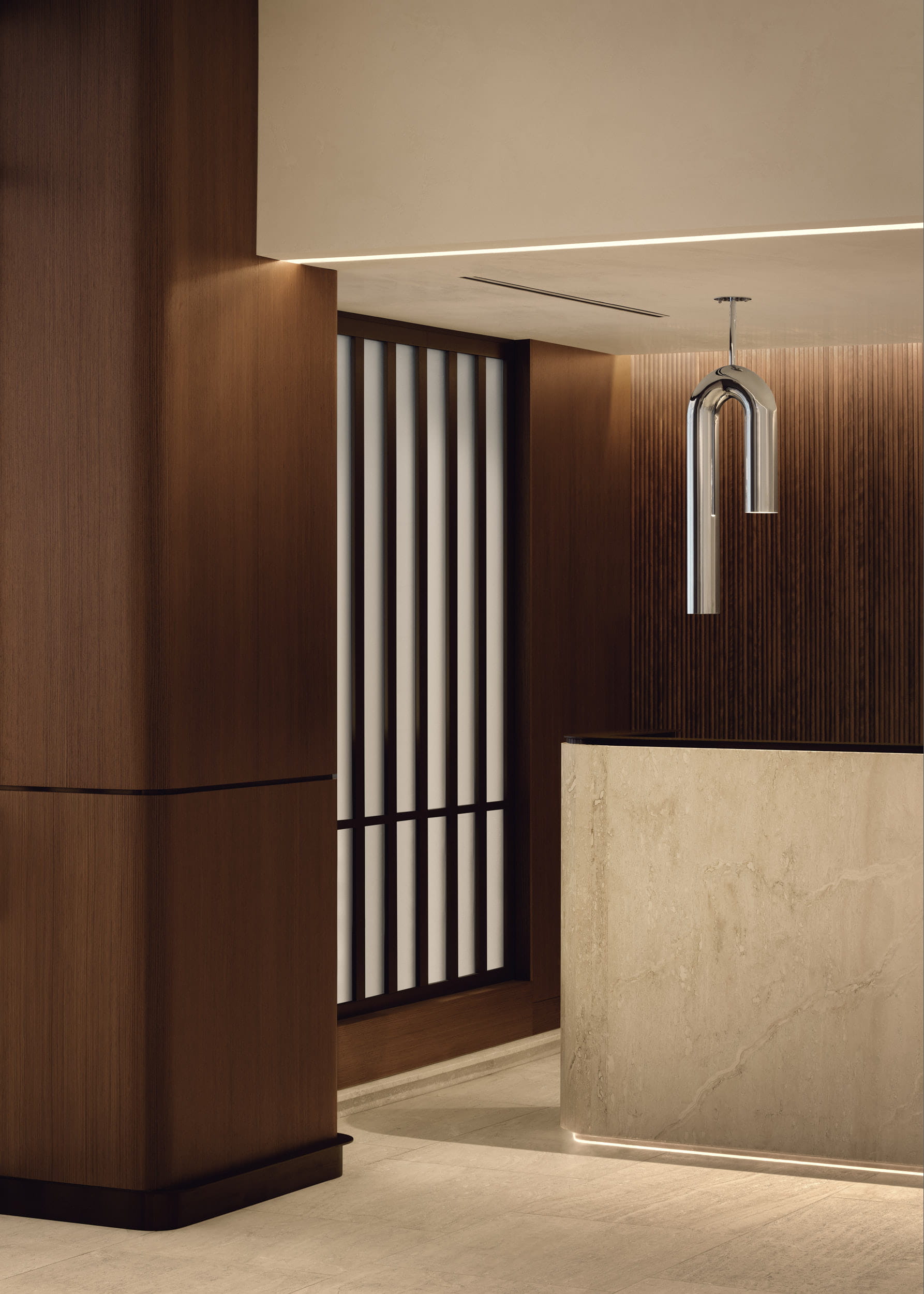 En clin d’œil à la haute couture, notre équipe compare les espaces nouvellement remodelés du Vogue Hôtel à un complet sur mesure. Chaque détail a été pensé avec soin, des murs et plafonds couverts de plâtre vénitien à l’ameublement sur mesure en chêne blanc du Québec. Les matières ont été choisies pour leur nobles qualités et leur référence aux savoir-faire ancestraux. Cette matérialité crée une tension poétique entre le clair et l’obscur; les planchers en travertin turc contrastent avec l’enfilade de colonnes en noyer italien sur toute la longueur de l’axe horizontal alors que les plafonds s’élèvent vers le ciel pour conférer des airs de hall majestueux.