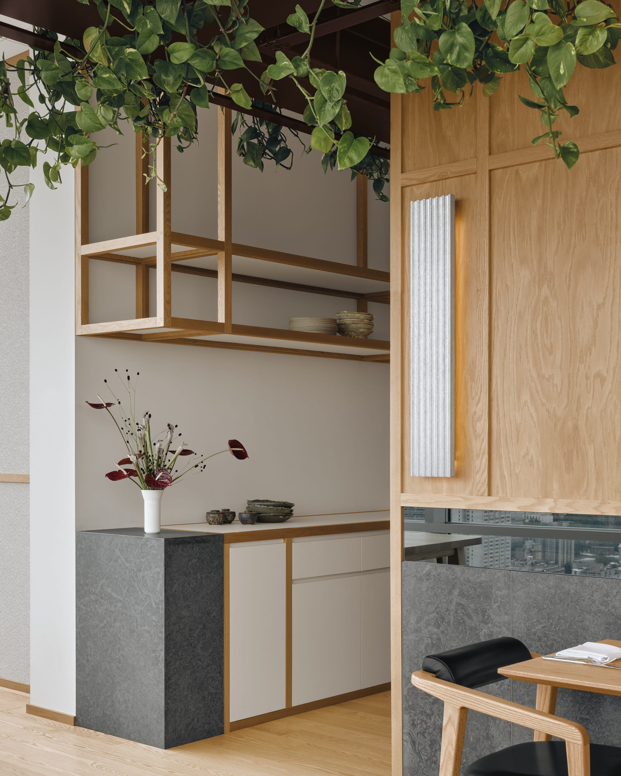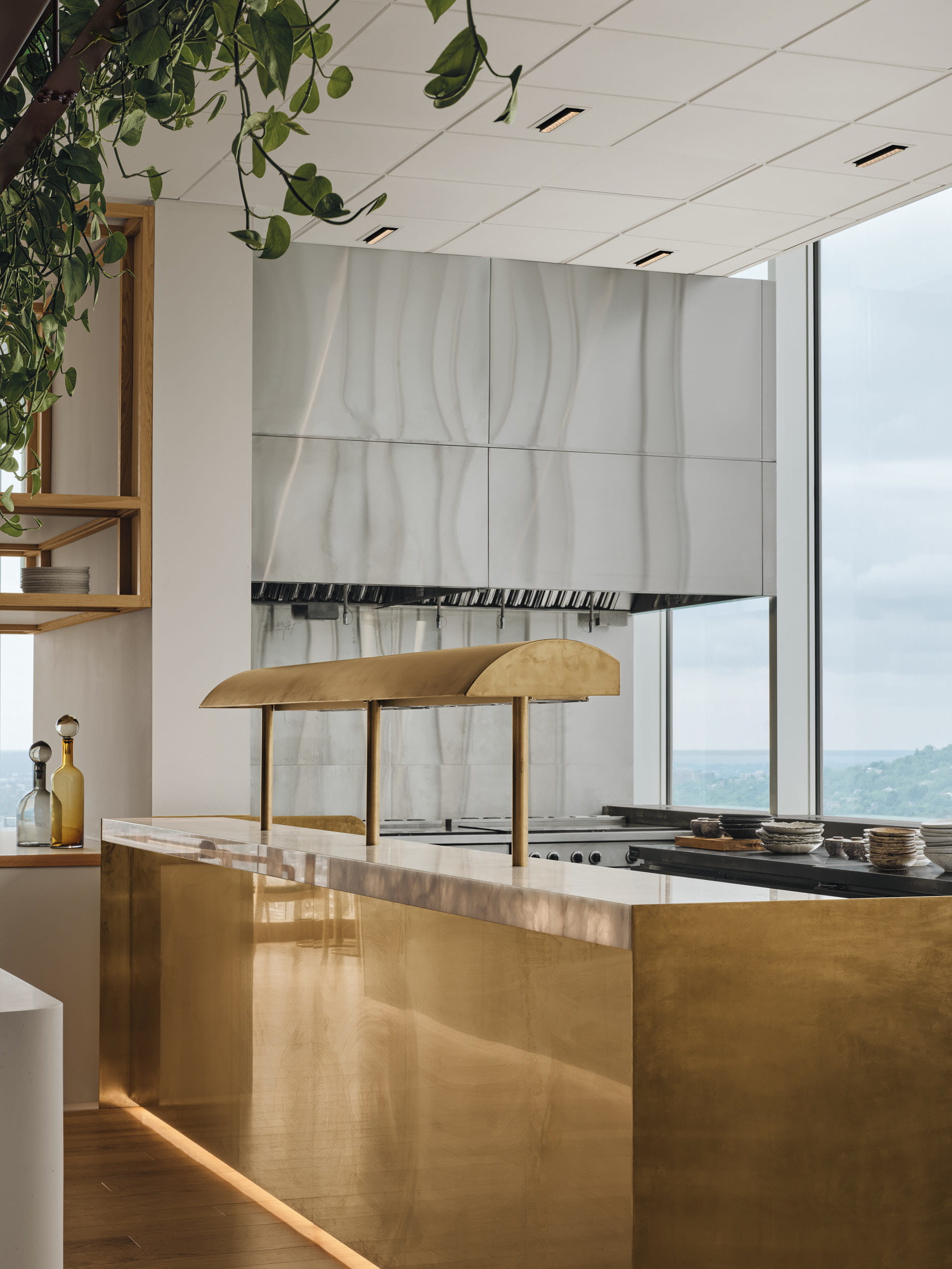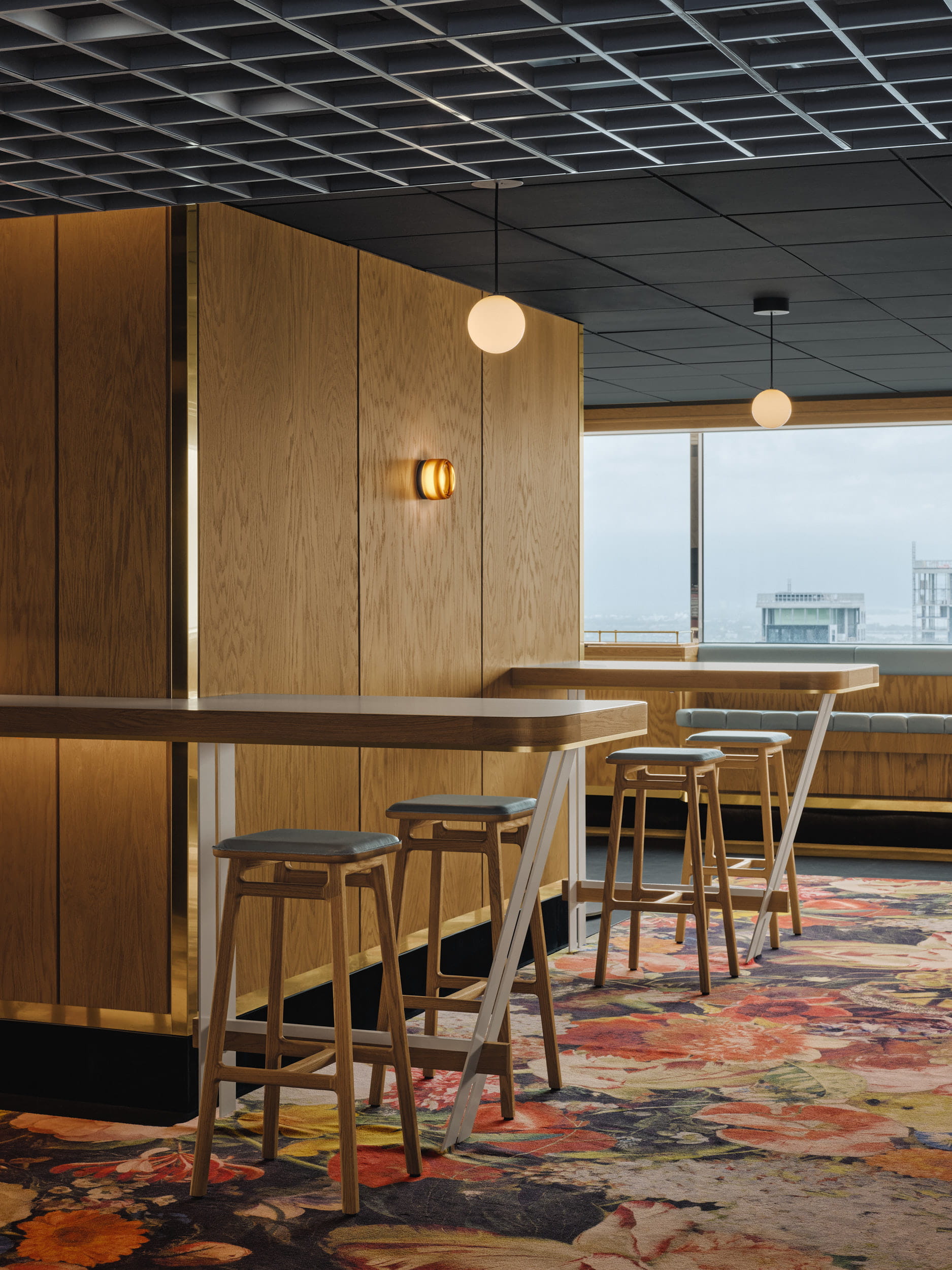 Le panorama de Hiatus dépeint Montréal comme une ville en symbiose avec la nature, lovée entre le fleuve et la montagne. La matérialité, quant à elle, souligne une harmonie analogue à l’écosystème environnant. Les deux bars de l'établissement mettent également en valeur cette dualité : le bar en laiton massif et Cristallo Bianco rétroéclairé au 46e étage offre une vue imprenable sur le fleuve Saint-Laurent au sud, tandis que le bar orienté vers le nord au 45e étage révèle le mont Royal, la pièce maîtresse de la ville.