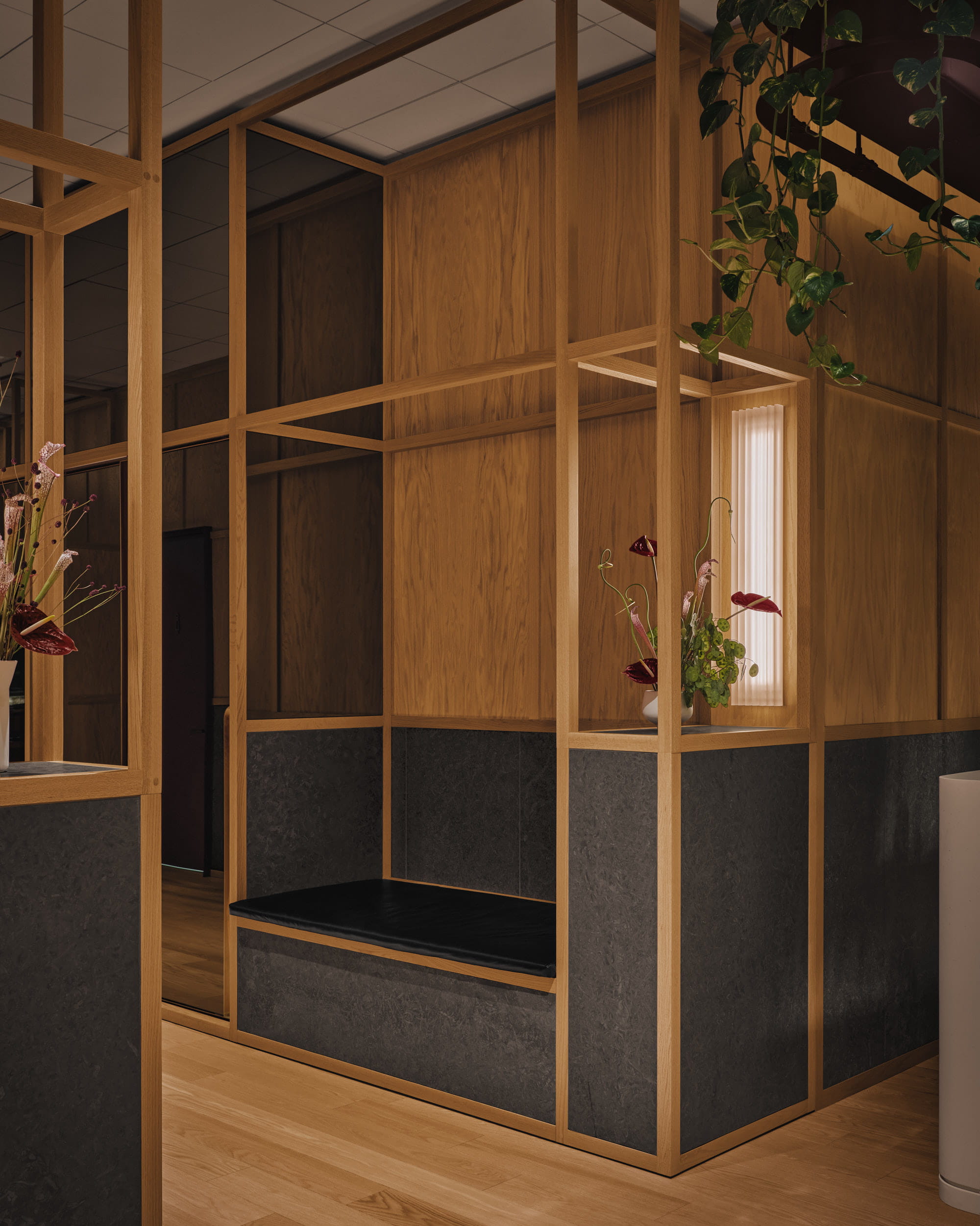 Si le 45e propose une atmosphère intime qui rappelle un voyage à bord d’un train, le 46e étonne avec ses plafonds voûtés et ses fenêtres pleine hauteur qui inondent l'espace de lumière naturelle. Des appliques murales, tantôt en acrylique, tantôt en aluminium poli, évoquent la façade texturée de PVM. Des installations lumineuses tubulaires en acier plaqué de zinc iridescent flottent à travers une jardinière suspendue couronnant tout l'espace. Des tables et des chaises en chêne rouge recouvertes de cuir noir rappellent les origines du bâtiment alors que des éléments contemporains, tels que de superbes plateaux de marbre Mystic Brown et Rainforest Green, ancrent subtilement le design dans le moment présent.
